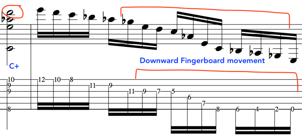 As we can see, it’s easy to move down the fingerboard shifting through scale and arpeggio along the way. [See, video above]