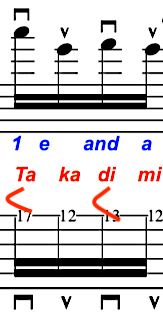This exercise starts on a down stroke: Try to accent the 1st and 3rd notes and count time as you do so: For example: