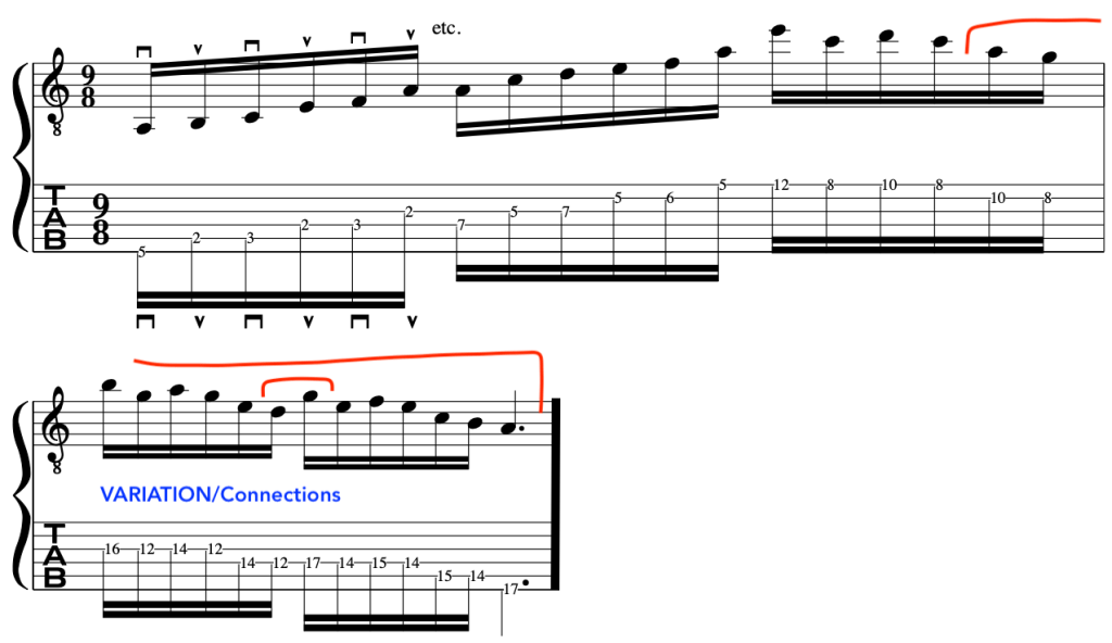 This arpeggio can throw your alternate picking because it breaks up the scale momentum. So, you have to prepare for it and be aware that there is a quick change of movement in the fretting hand as you cross the strings.