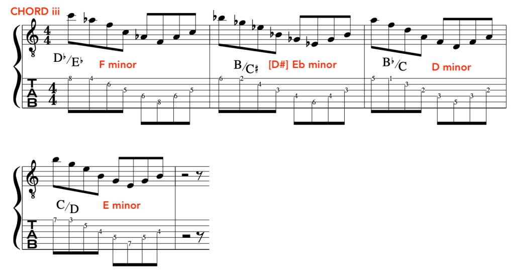 For the last part we will employ chord iii of Db Major throughout: This of course being F minor:
