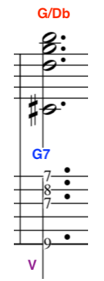 To manipulate this next Dominant chord we will put the flattened 5th [Db] in the bass and exploit a G triad on top:
