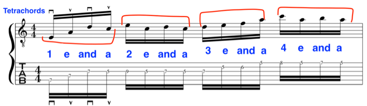 In regards to the alternate picking the first tetrachord/cell starts on a “Down Stroke”.