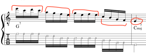 The key to this mid tempo alternate picking style is to divide the groupings into “Tetrachords” [or four note cells] and count the BPM [e,g 130-140] time as you pluck the notes with the guitar pick.