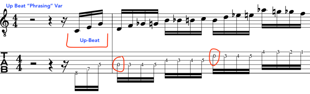 NOTE: I am starting this on an “Up” stroke, so that when I start on the beat of the first bar I can employ the “Down” stroke” for “Even” tetrachord [4 note] groupings.